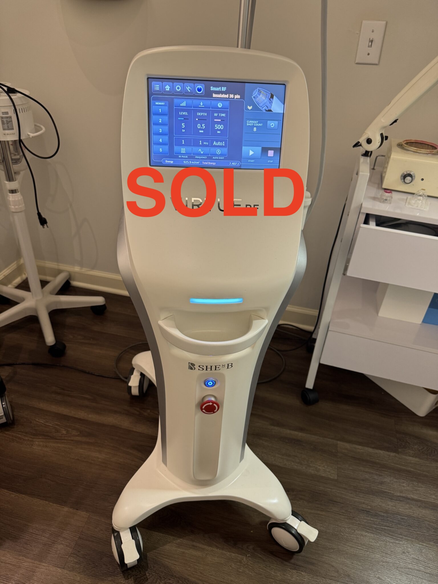 This RF microneedling machine boasts elevated design details, including the three unique handpieces, a lower profile, longer cords and an ergonomic arm to distribute weight evenly for maximum comfort and mobility.